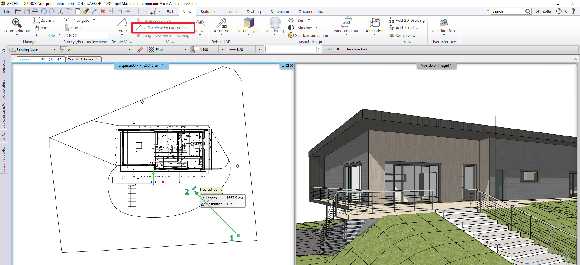 該指令只需定義相機的位置和觀察點,藉由在 2D 視圖中點選兩點,即可設置兩點透視的 3D 視圖。 。